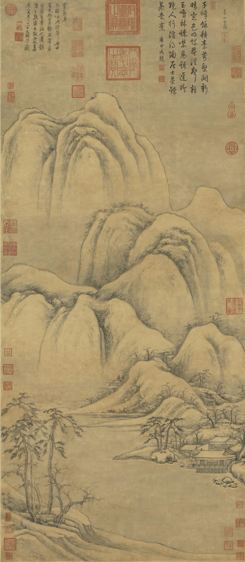此幅绘雪峰巍然,中有一线清泉飞出,一河两岸,河水以淡墨渲出,平静无波,巨松古木,临水别院,阒寂无人,仿佛世外之景。本幅全用郭河阳之法,而加以精简,实是曹云西自家之法。有学者认为是其早期仿宋人之精品,无据,不足为凭,且1351年,云西已是七十九老翁(据黄子久跋),何来早年。